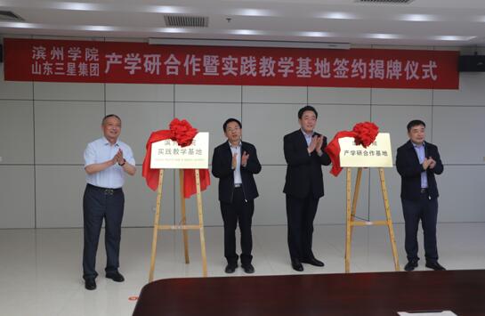 簽約儀式中,濱州學院副校長李偉年、三星集團副總經(jīng)理孫喜代表雙方簽約,李長海、皮臺田、崔本明、王明峰分別為實踐教學基地及產(chǎn)學研合作基地揭牌。