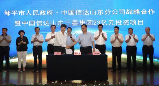 2020年7月,鄒平市人民政府·中國信達(dá)山東分公司戰(zhàn)略合作暨中國信達(dá)山東三星集團(tuán)23億元投資項(xiàng)目簽約儀式圓滿成功。鄒平市人民政府、中國信達(dá)、山東三星集團(tuán)三方就推動(dòng)國有資產(chǎn)、非公資產(chǎn)深度合作,優(yōu)化地方金融發(fā)展環(huán)境達(dá)成共識(shí)。