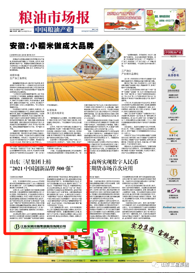 山東三星集團負責人表示,未來,山東三星集團將繼續(xù)聚焦實業(yè),做精主業(yè),拓寬創(chuàng)新思維,增強創(chuàng)新能力和核心競爭力,推進綠色低碳發(fā)展、數(shù)字化轉(zhuǎn)型發(fā)展,以產(chǎn)業(yè)高質(zhì)量發(fā)展助力鄉(xiāng)村振興,為山東經(jīng)濟社會發(fā)展貢獻民企新?lián)敗?原文刊登于2021年8月24日糧油市場報中國糧油產(chǎn)業(yè))