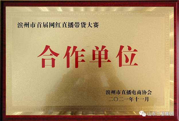 近日,“促進電商發(fā)展 助力鄉(xiāng)村振興”濱州市首屆網(wǎng)紅直播帶貨大賽暨濱州市身殘志堅達人直播大賽頒獎典禮隆重舉行。山東三星集團電商運營中心直播團隊憑借出眾的帶貨能力和業(yè)界影響力榮獲三等獎,并代表企業(yè)接牌特約“合作單位”榮譽獎牌。