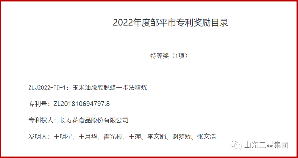 其中,長壽花食品“玉米油脫膠脫蠟一步法精煉”專利項目斬獲鄒平市專利獎特等獎;裕航合金公司“一種高速常導(dǎo)磁懸浮列車用軌排感應(yīng)板的生產(chǎn)方法”、機械公司“一種地板與橫梁一體式集裝箱”專利項目分獲鄒平市專利獎二等獎。