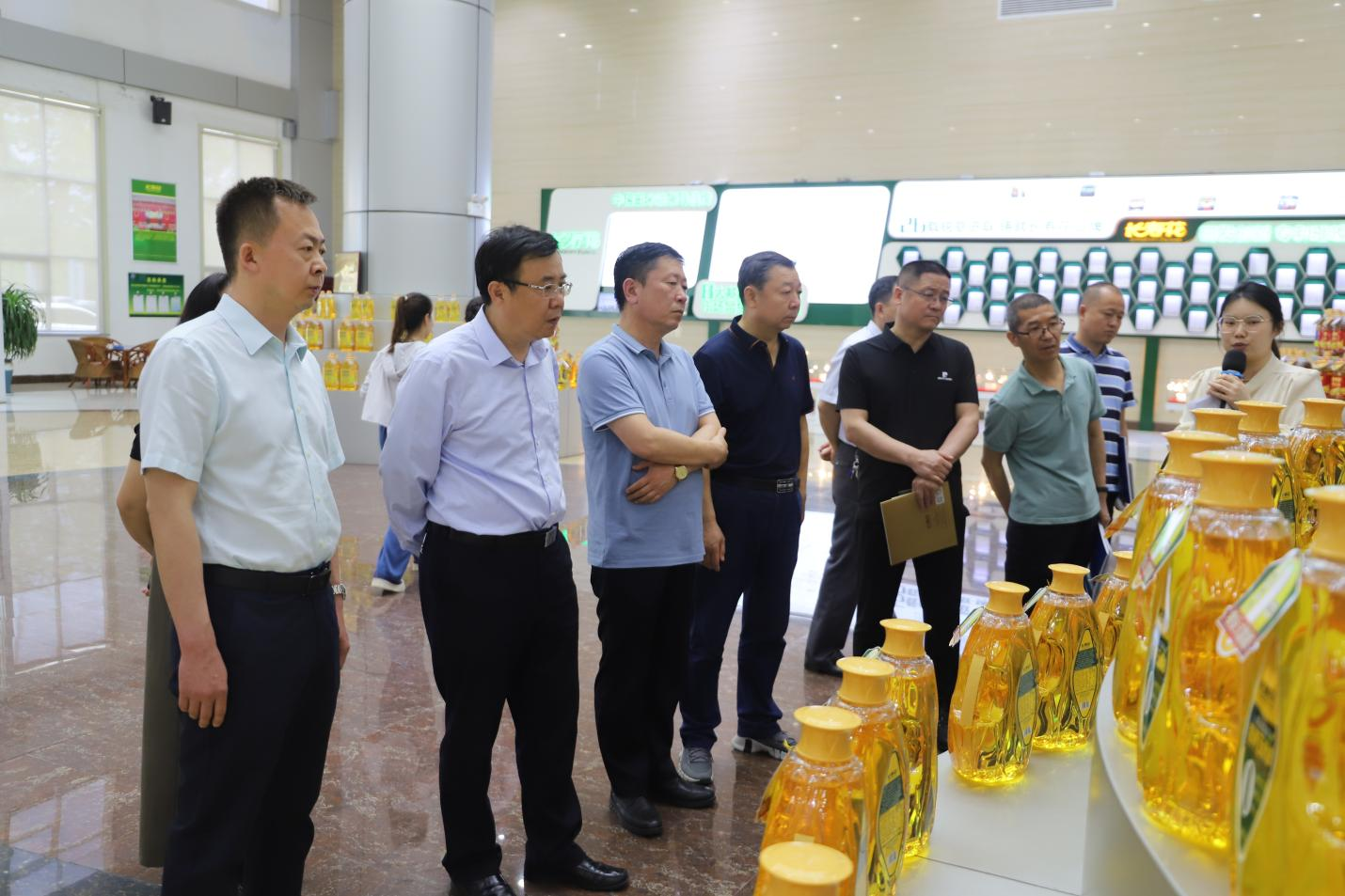 在長壽花食品全自動灌裝包裝生產(chǎn)基地,考察領(lǐng)導(dǎo)詳細(xì)了解長壽花生產(chǎn)工藝流程及系列主導(dǎo)產(chǎn)品等相關(guān)情況,韓延庭就企業(yè)產(chǎn)能規(guī)模、新品創(chuàng)新研發(fā)、市場拓展應(yīng)用等內(nèi)容進(jìn)行了闡述說明,與調(diào)研領(lǐng)導(dǎo)進(jìn)行了溝通交流。