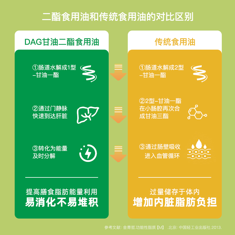 甘油二酯不同于甘油三酯。由于在結(jié)構(gòu)上缺少一個(gè)脂肪酸,甘油二酯在經(jīng)小腸粘膜細(xì)胞消化吸收后,無法合成甘油三酯結(jié)構(gòu)進(jìn)入血液,而是由號稱“細(xì)胞發(fā)電站”的線粒體代謝供能,不易在體內(nèi)造成脂肪累積。因此廣受關(guān)注。