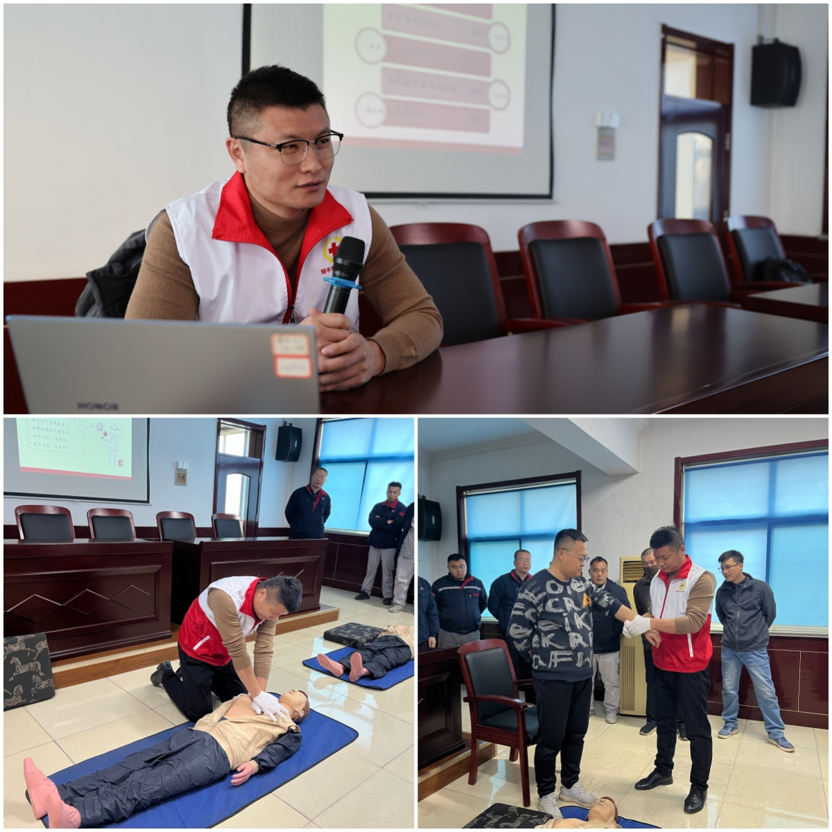 此次培訓(xùn)通過(guò)理論與實(shí)踐相結(jié)合,鄒平市紅十字會(huì)的講師詳細(xì)講解了心肺復(fù)蘇(CPR)、自動(dòng)體外除顫儀(AED)的使用方法,教授了成人、兒童氣道異物梗阻與海姆立克急救法等急救技能,并以模擬橡膠人為器具,現(xiàn)場(chǎng)演示正確的心肺按壓的方法,重點(diǎn)講解了按壓位置、手法、頻率和深度等,還對(duì)外傷的包扎處理等多項(xiàng)急救技能知識(shí)進(jìn)行實(shí)操演示。