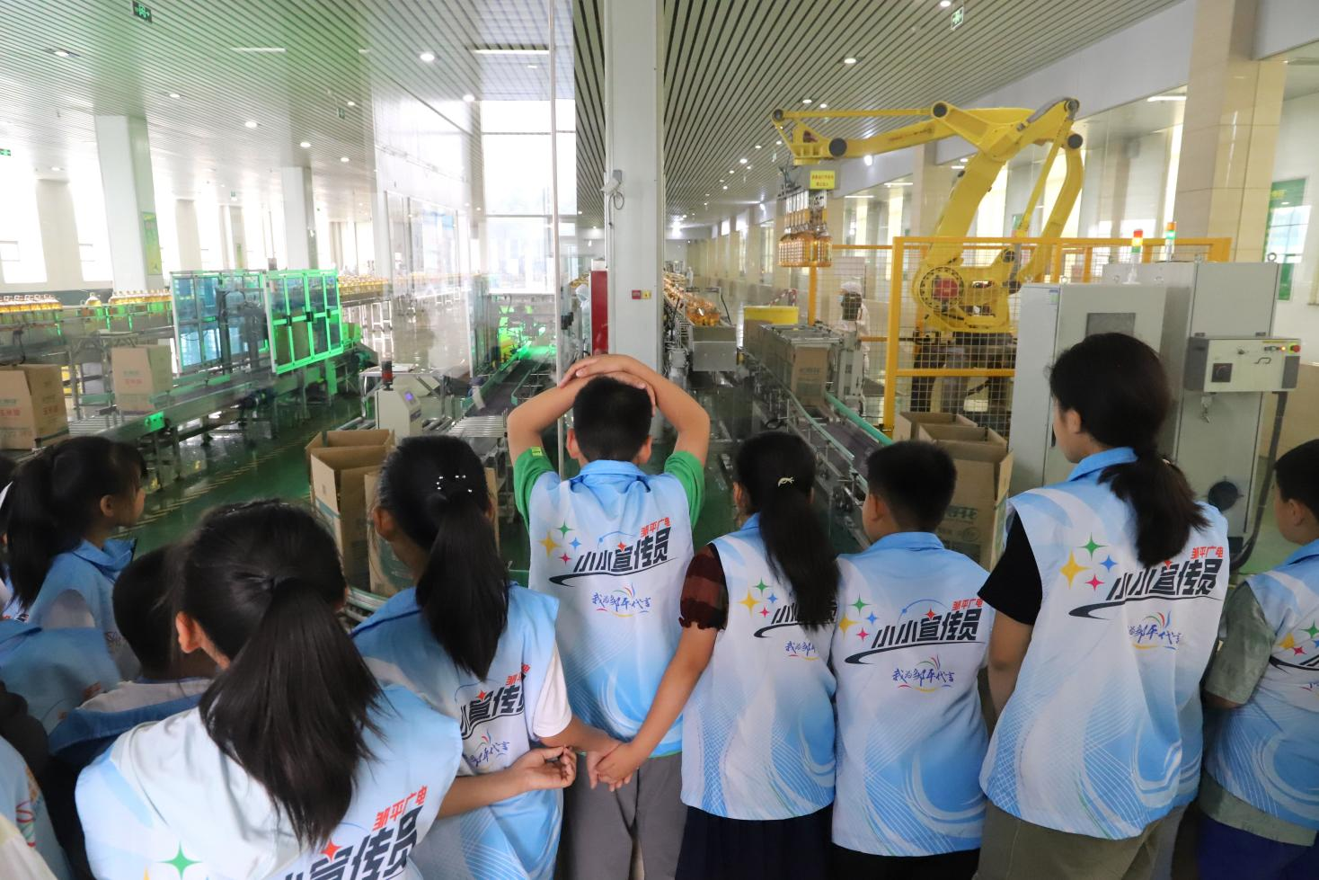在全自動灌裝包裝車間,機(jī)器人不斷揮舞機(jī)械臂,一箱箱玉米油整裝待發(fā),孩子們更是興致盎然,透過玻璃感受這撲面而來的現(xiàn)代化智能制造的氣息。
