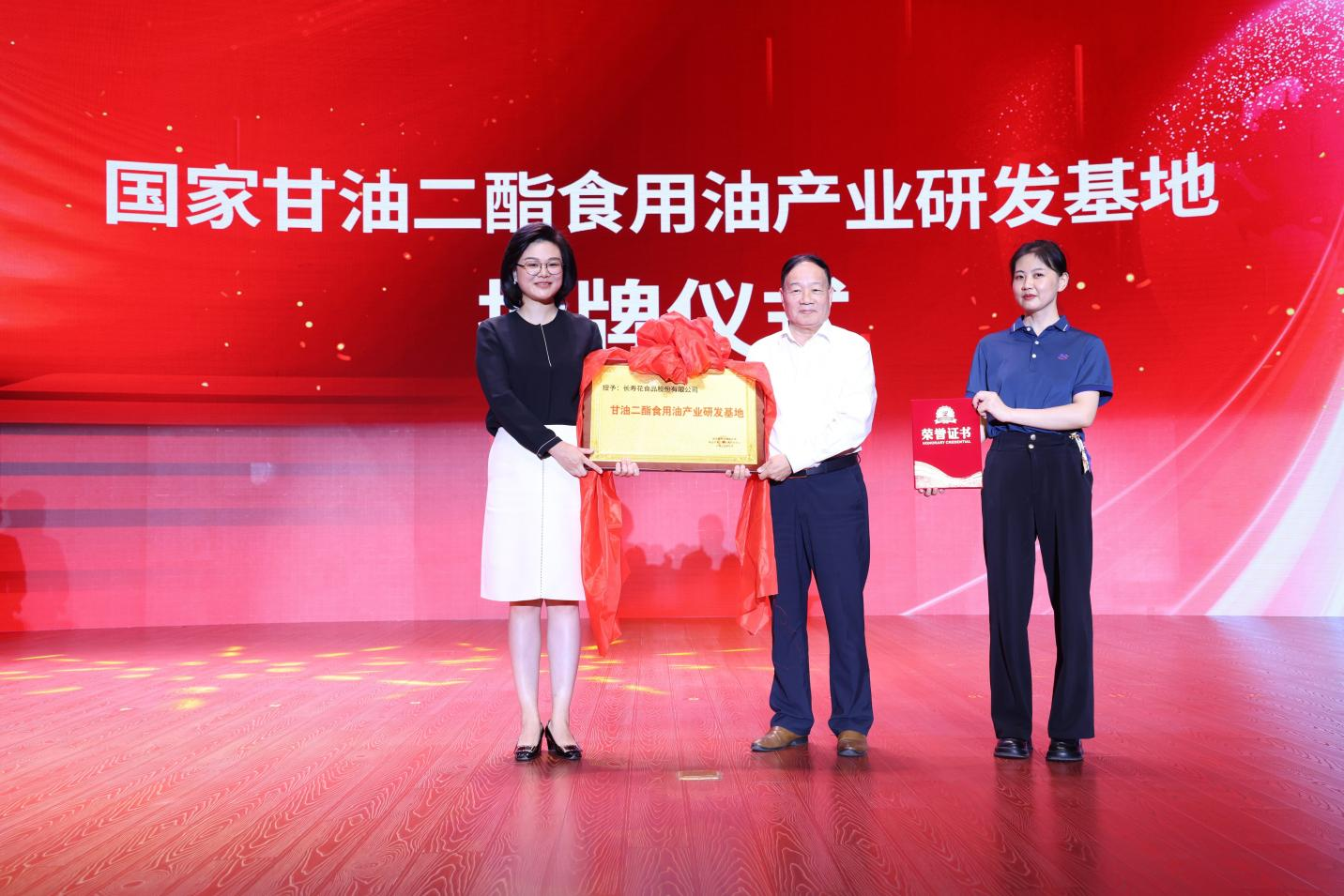 大會同期舉行了“國家甘油二酯食用油產(chǎn)業(yè)研發(fā)基地”授牌儀式。山東三星集團(tuán)董事長、總裁王亞群從中國糧油學(xué)會油脂分會會長何東平手中接過授牌,這也是繼“國家玉米油產(chǎn)業(yè)研發(fā)基地”后,長壽花獲得的又一國字號“產(chǎn)業(yè)研發(fā)基地”金字招牌。