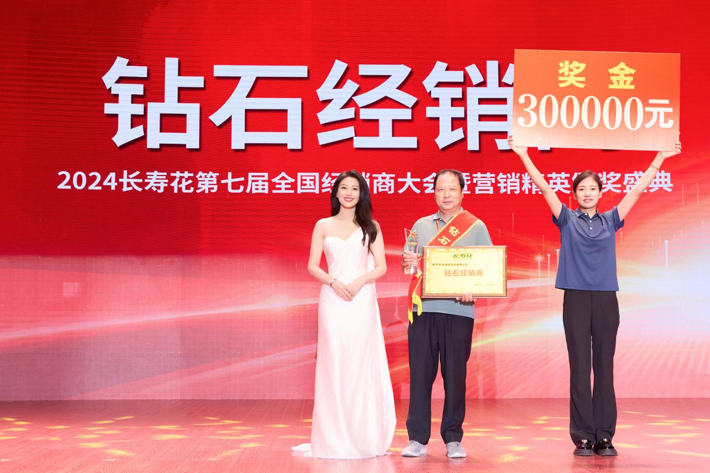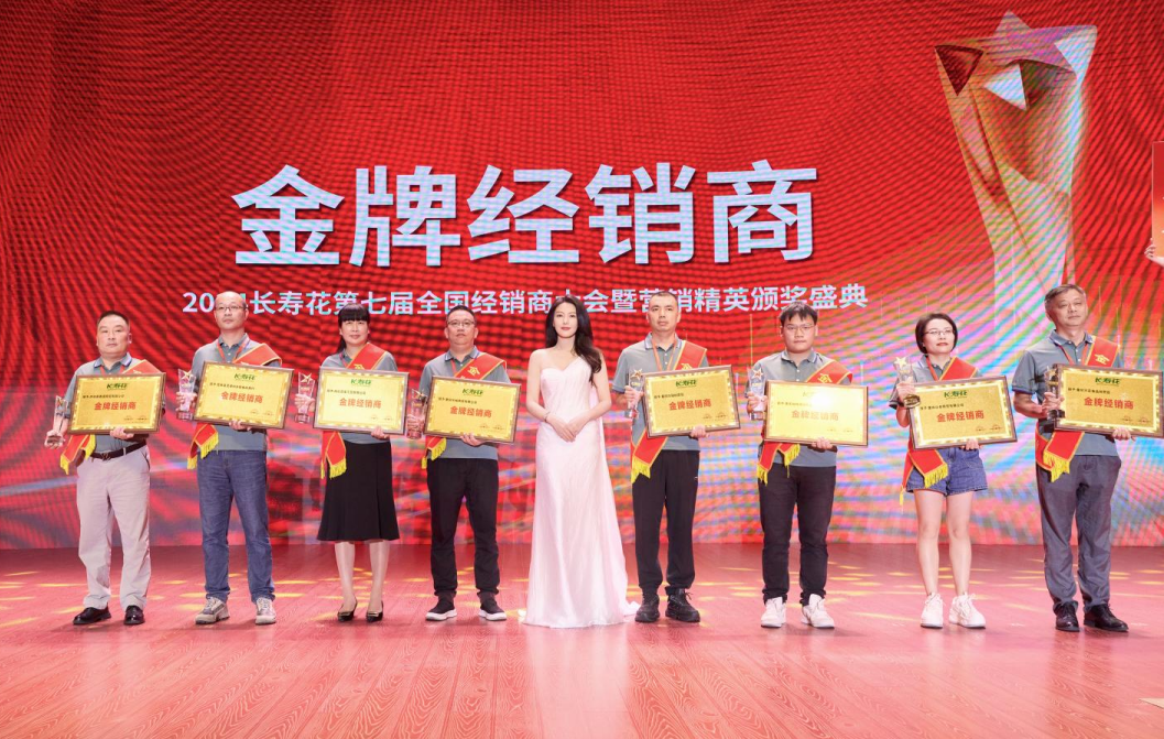 頒獎盛典上,長壽花食用油代言人高圓圓為金牌經(jīng)銷商和鉆石經(jīng)銷商頒獎,并現(xiàn)場溫馨互動。