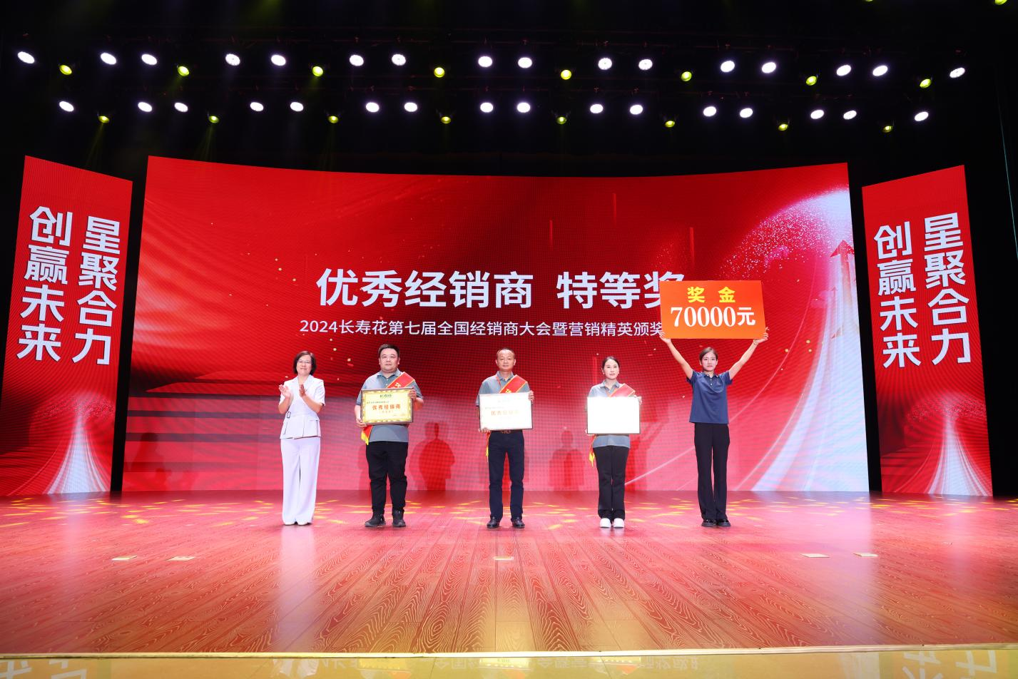 熱烈盛大的頒獎盛典環(huán)節(jié),大會對鉆石經(jīng)銷商、金牌經(jīng)銷商,優(yōu)秀經(jīng)銷商、突出貢獻(xiàn)大區(qū)、優(yōu)秀大區(qū)及市場突破新銳經(jīng)理、新產(chǎn)品銷售先進(jìn)個人、優(yōu)秀辦事處主任、優(yōu)秀業(yè)務(wù)員、優(yōu)秀促銷員等17個團(tuán)隊、個人獎項進(jìn)行了表彰獎勵。