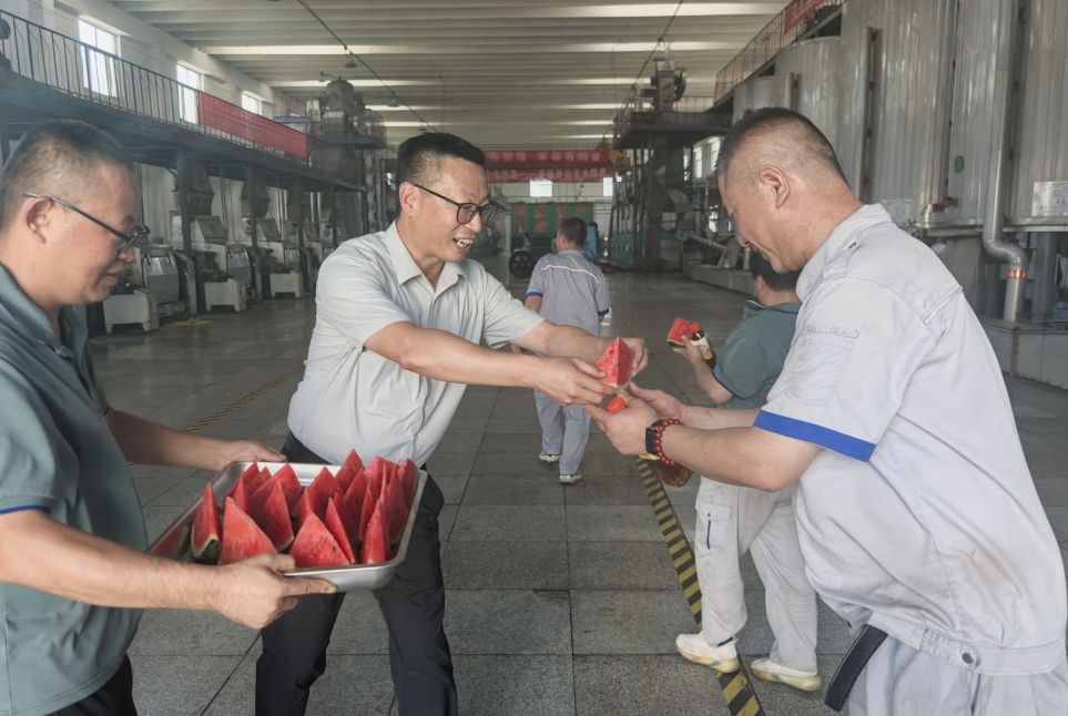 近日,持續(xù)的高溫天氣給堅(jiān)守崗位的一線員工帶來嚴(yán)峻“烤”驗(yàn)。為切實(shí)保障炎炎夏日一線員工身心健康,長(zhǎng)壽花糧油加工公司執(zhí)行總經(jīng)理王學(xué)剛、長(zhǎng)壽花食品科技公司執(zhí)行總經(jīng)理王奎帶著西瓜、涼茶等降溫物品深入生產(chǎn)車間一線,為員工送去清涼與關(guān)懷。