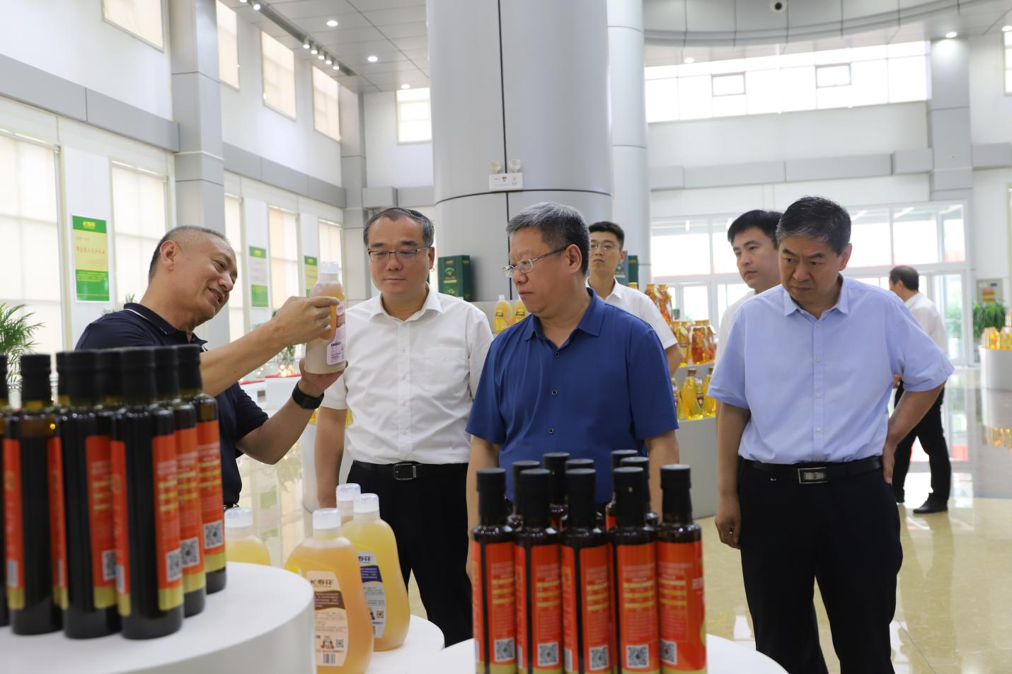 調(diào)研領導一行先后到長壽花產(chǎn)品展廳、全自動灌裝包裝生產(chǎn)車間實地參觀調(diào)研,現(xiàn)場聽取了企業(yè)資源整合、產(chǎn)業(yè)布局規(guī)劃及創(chuàng)新成果轉(zhuǎn)化等相關工作情況介紹,并與王明峰進行了深入交流。
