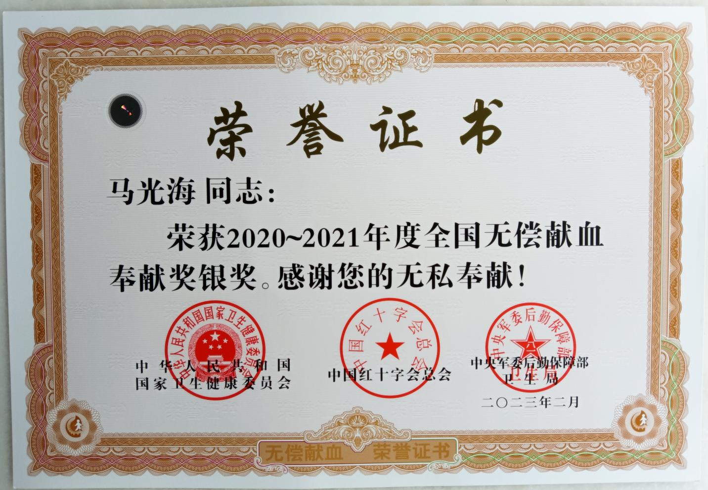 無(wú)償獻(xiàn)血,讓愛(ài)傳遞。7月14日,一份最有意義的榮譽(yù)證書(shū)發(fā)放到通遼公司行政副總經(jīng)理馬光海手中,他因無(wú)私獻(xiàn)血榮獲2020—2021年度全國(guó)無(wú)償獻(xiàn)血奉獻(xiàn)獎(jiǎng)銀獎(jiǎng)。